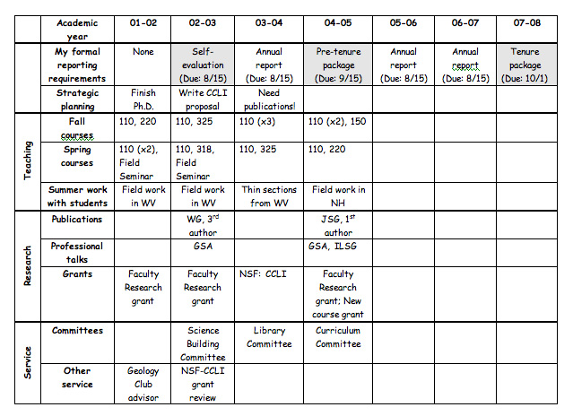 When Rachel O'Brien was writing her self-evaluation for her "pre-tenure review" at Allegheny College, she found herself wanting a visual aid to gain a comprehensive view of how her career was evolving. She created the table below for that purpose. It allowed her to track her professional activities and identify her strengths as well as her weaknesses. This helped her to prioritize her short-term goals as she prepared for tenure review.