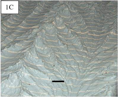 1C) r/u = 8; landslides are absent, and surface runoff dominates erosional processes. Scale bar is ~5 cm.