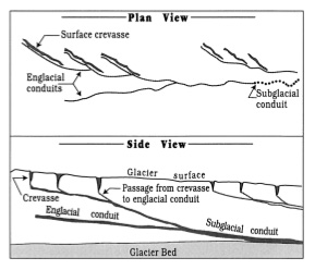 Geometry of hypothetical englacial drainage system, comprising both gently plunging conduits spawned by crevasse-bottom streams and steeply plunging conduits formed where water exploits veins in the ice. From Fountain and Walder, 1998.