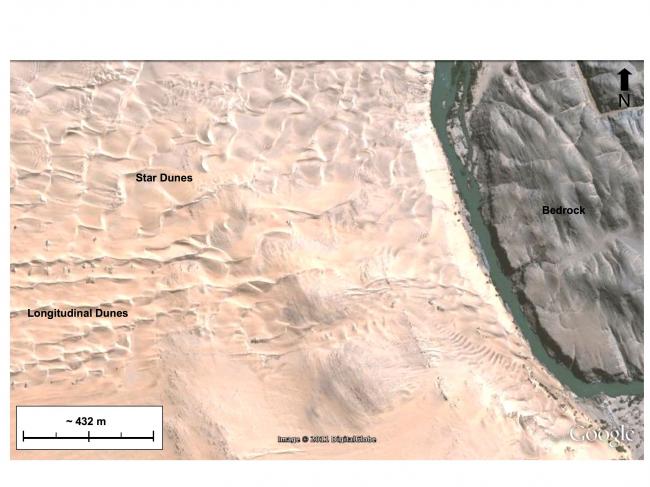 Dune morphologies present in the eastern side of the Cunene Sand Sea include star dunes and longitudinal dunes.