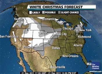 from www.weather.comAs scientists and science students we are used to thinking that quantitative measures of nature are the most informative or rigorous form of description. By this value system, a forecast of 0.9 inches or 1.5 inches, or whatever, would be superior to the two-category, threshold-based system of white/non-white Christmas. However, the two-category system latches onto the human emotional system in a way that the numerical system does not. "White Christmas" pulls forth memories and dreams; "1.1 inches on December 25" does not.