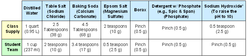 * NOTE: Mono Lake water has a pH of 10. If you want to use a 1-molar sodium hydroxide (NaOH) solution to raise the pH to 10 instead of solid crystals, use 50 ml of 1M NaOH for the class supply and 12.5 ml for the student team.