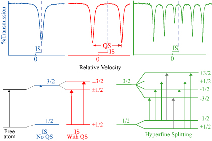 If the electrons around the Fe atom create a magnetic field, as in the case of magnetite, then the energy levels in the Fe nucleus will split to allow six possible nuclear transitions, and a sextet (six-peak) spectrum results. The positions of the peaks in the sextet defines what is called the hyperfine splitting (Hint or BHf, depending on the units used) of the nuclear energy levels.