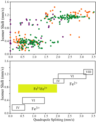 The combination of isomer shift and quadrupole splitting (along with the hyperfine field, in the case of magnetic phases) is used to identify the valence state and site occupancy of Fe in a given site and individual mineral (Figure 4). If the phase is magnetically ordered, additional information in the form of a value for the magnetic field (usually given in Teslas) can help with identification of some phases.