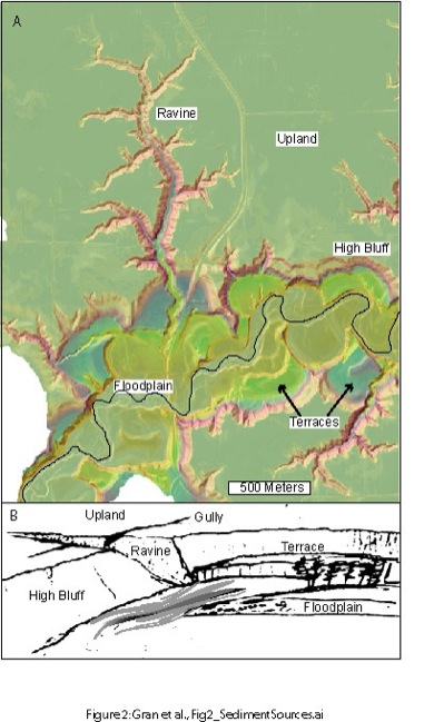 View Original Image at Full SizeHigh-resolution LiDAR topography reveals location of terraces, bluffs, and ravines inset into the relatively flat uplands. Eventually, there will be a cross-section to discuss, too.