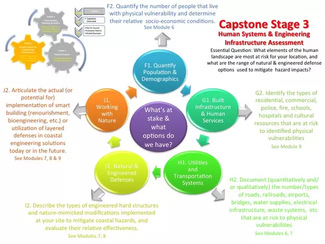 Capstone Project: Stage 3: Figure 1: Capstone Stage 3 plan to evaluate student progress via system thinking. The top diagram shows where Stage 3 fits in the capstone project. The bottom diagram shows five steps you need to take to link the different elements of Stage 3.