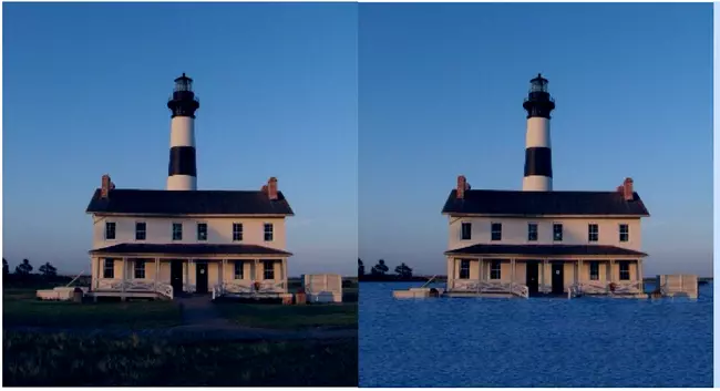 Figure 12.22: The historic Bodie Island Lighthouse in the Outer Banks of North Carolina, shown at present-day high tide (left) and with four feet of sea level rise (right). Vulnerability assessments may not capture the symbolic or cultural importance that such landmarks hold for the local community.
