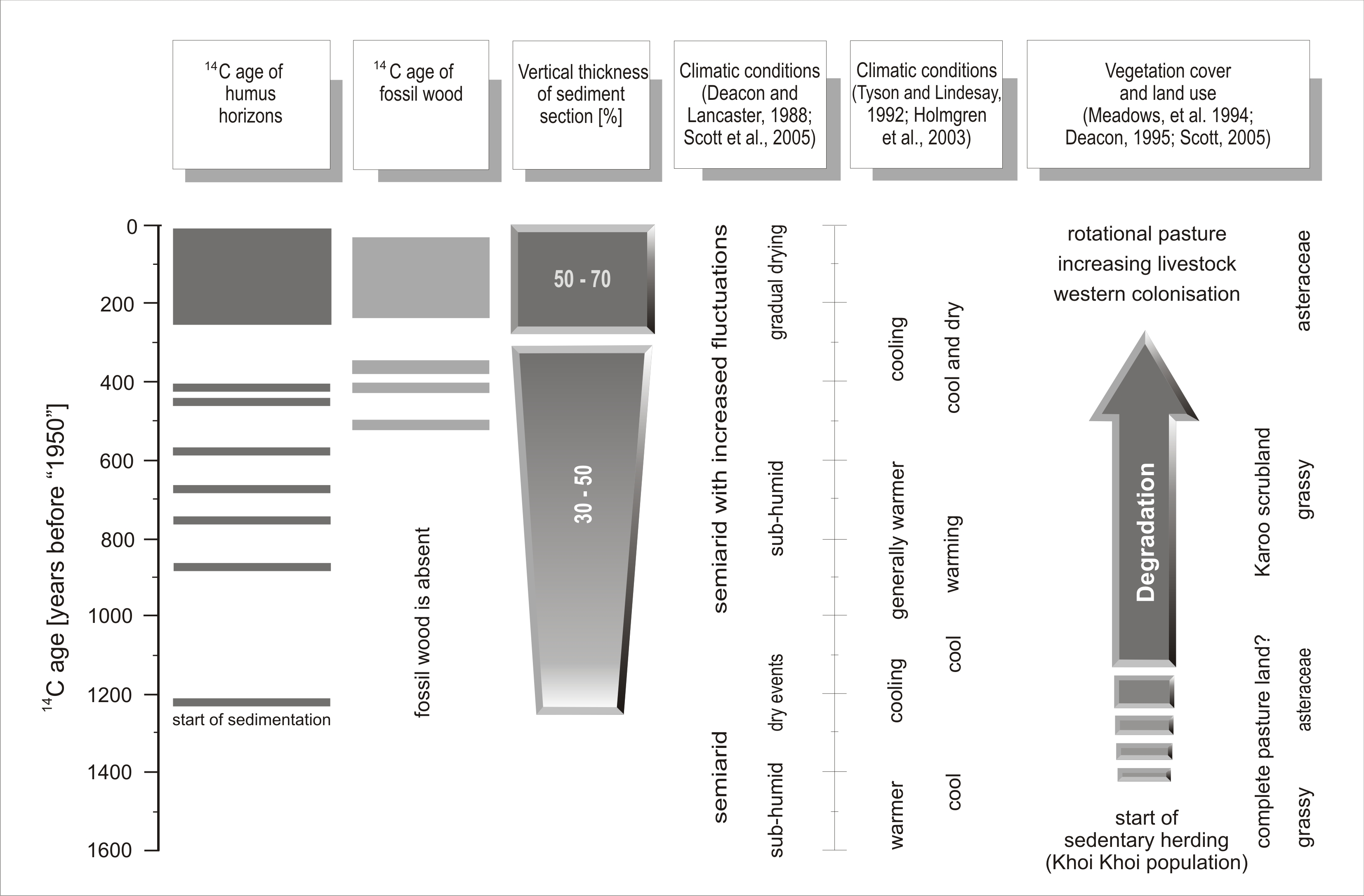Present state of knowledge of climate change, vegetation cover and land-use change in the Cape Province in connection with radiocarbon dating of organic sediments, fossil wood, and mean vertical thickness of sediment sections in the Gourits River basin (modified after Damm and Hagedorn, 2009)