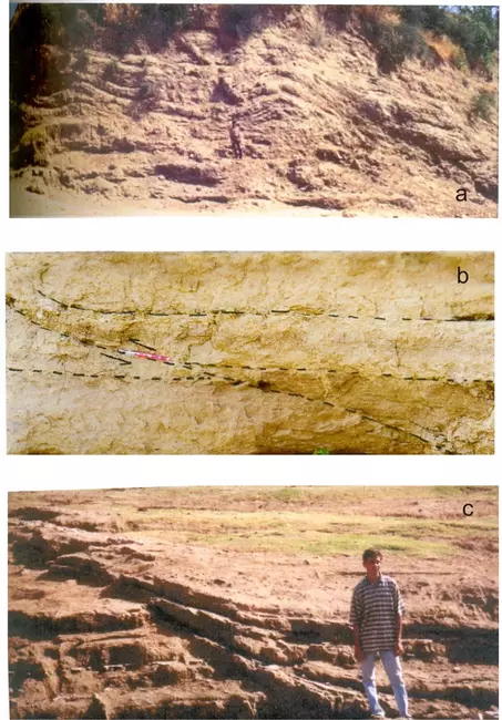 Fig. 5. (a) Intraformational open folds in the overbank deposits (height of the person is 1.65 m). (b) Small-scale low-angle thrust fault in the overbank deposits (length of the pencil is 12 cm). (c) Syndepositional slump structure in the alluvial plain sediments (height of the person is 1.65).