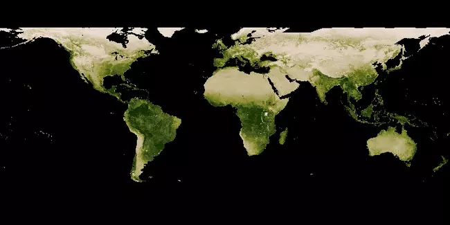 Figure 8. MODIS satellite image renderings of vegetation coverage for July 2013 (top) and January 2013 (bottom). Gradations of green indicating leafy vegetation with the darkest green reflecting highest coverage of plants. Brown colors are ice or desert and black is "no data" (largely the oceans). Note the seasonal differences most pronounced in the northern hemisphere.