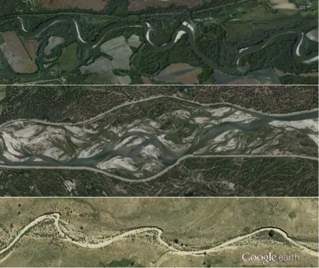 Figure 28. Examples of several different types of rivers. From top to bottom: Minnesota River near Mankato, MN (meandering, 100 m wide channel); Snake River in Grand Teton National Park, WY (braided , 1 km wide braid plain); ephemeral wash near Santa Fe, NM (ephemeral and meandering, 20 m wide channel).