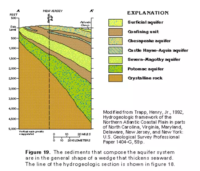 Figure 21. Layered sequence of major aquifer and aquitard units in the Atlantic Coastal Plain system. The sedimentary units dip and thicken to the East.