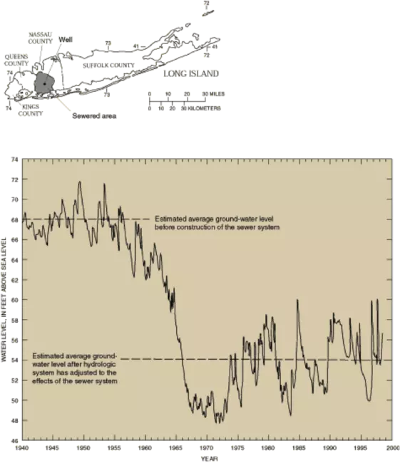 Figure 40. Hydrograph from monitoring well in Long Island, illustrating steady state conditions from about 1940 to about 1960, and a new steady state after the system equilibrated to construction of a sewer system and concomitant reduction in recharge by about 1975. The perturbation (change in infiltration and recharge) led to non-steady conditions from around 1960-1973, manifested in a clear decrease in water level.