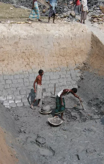 Figure 5. A pit in Bangladesh illustrating the oxidation (red)/reduction (gray) front in the subsurface. Note that As concentrations in water>10ppm are considered toxic to humans.