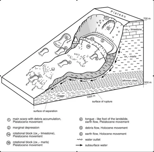 Figure 2. Three-dimensional model of a slump-earthflow as characteristic landslide at the Swabian cuesta scarp (Kreja and Terhorst, 2005, modified).