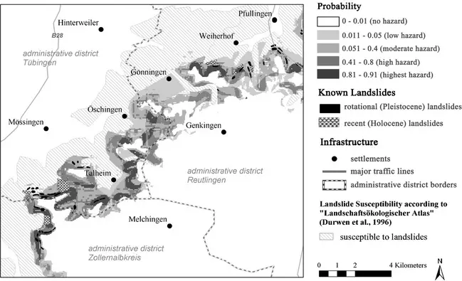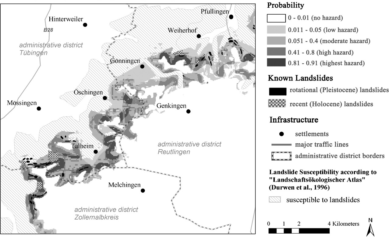 Figure 5. ‘Weight-of-evidence-method’ landslide susceptibility map for a large area of the cuesta scarp (Neuhaeuser and Terhorst, 2007).