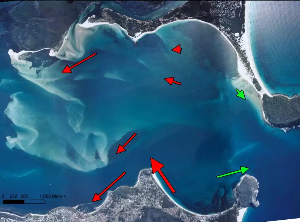 View Original Image at Full SizeAerial photograph showing the deployment locations and combined current velocity and duration index with dominant flow direction. Arrows are drawn to scale relative to index such that a longer arrow indicates a greater velocity or duration asymmetry.