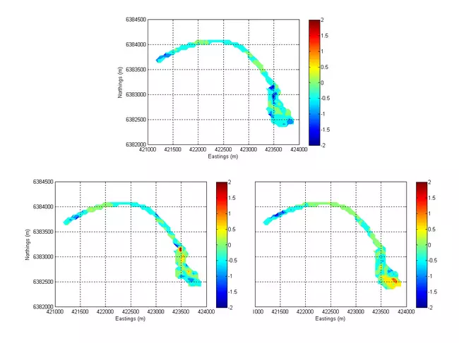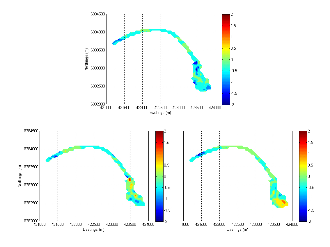 View Original Image at Full SizeFigure 4: Overall accretion/erosion occurring in the northern shoreline of Port Stephens estuary during low-energy high-frequency storms (upper panel, March to May 2007) and during high-energy low-frequency storms (lower panel, May to June 2007 and June to July 2007).