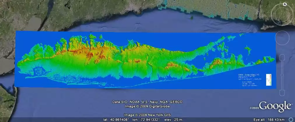 A Google Earth overlay of a Long Island digital elevation model developed by Gilbert Hanson at Stony Brook University