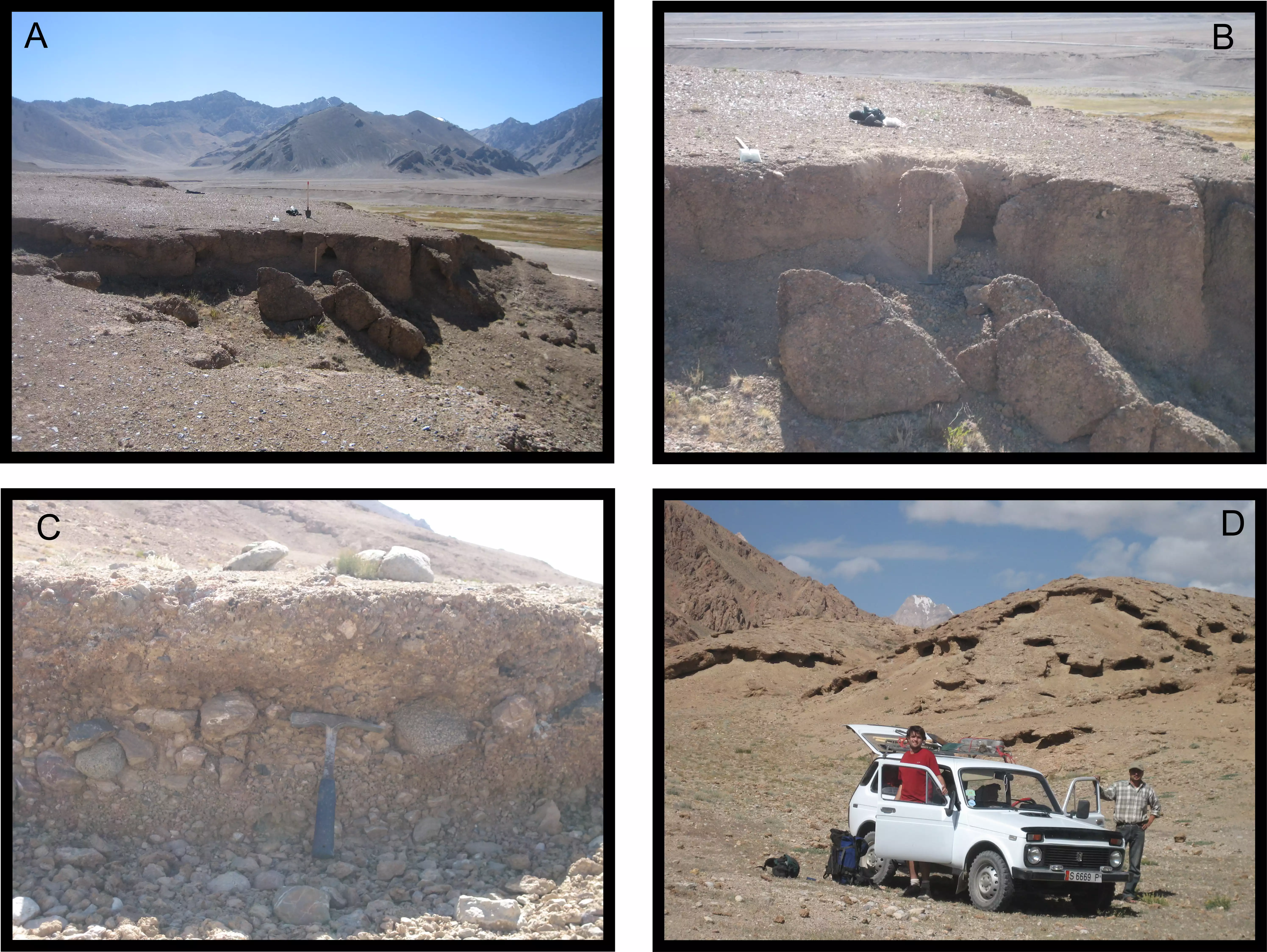 View Original Image at Full SizeField photographs of carbonate cemented landforms: a)fluvial terrace at Kara Syy, Tajikistan; b)closeup of Kara Syy terrace, note carbonate cemented blocks in foreground; c)resistant upper surface of a carbonate cemented fluvial terrace near Chesteve, Tajikistan; d)collapse of a carbonate cemented fluvial terrace near Kara Syy, Tajikistan.