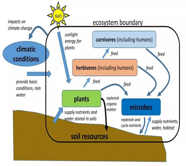 Fig. 1.2.1. A simplified diagram of a typical ecosystem. Ecosystems are a common system type analyzed by geoscientists, ecologists, and agroecologists. The black rectangular outline is one way to define a boundary for the ecosystem, where climate and sunlight fall outside the system but provide resources and define the conditions under which the ecosystem develops. This diagram can also be considered a type of concept map where for example 'sun', 'plants', and 'climate' are <em>components</em>, and the arrows connecting the components are <em>relationships </em>in the system. These relationships are now labeled as either flows (of energy, food, nutrients) or causal links, like the way that dead plants and animals end up feeding soil microbes, or the ecosystem affects the climate over time. You may be able to see how this simplified diagram could represent a far more complex system containing hundreds of plant and animal species and thousands of types of microbes, interacting in complex ways with each other and the environment. Keep this diagram in mind as a possible example when you think about completing your preliminary concept map of a regional food system at the end of unit 1.