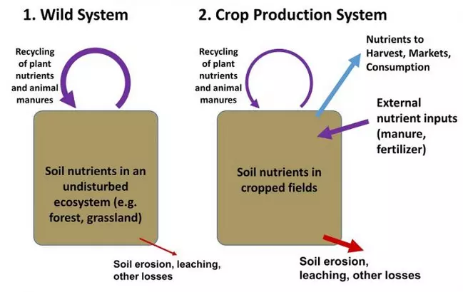 Fig. 5.2.1: Nutrient cycling (biogeochemical cycling) in a closed natural ecosystem (left) and a crop production system (right) in which humans must replace exported nutrients from soils through the use of plant residues, manure, and other soil fertility inputs. The magnitude of soil nutrient losses in flows such as erosion, leaching, and nitrogen gas emissions from soils tends to also be greater in the cropped system than the losses from soils found in natural systems. The relationships of crop management to nutrient cycling will recur in greater detail in Module 7 with the concept of an agroecosystem.