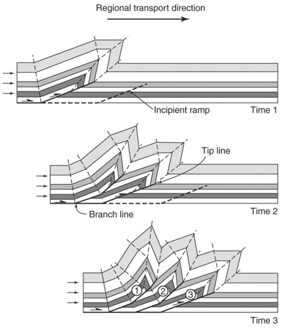 Thrust footwall imbrication. Younger thrusts are deforming older faults and folds.