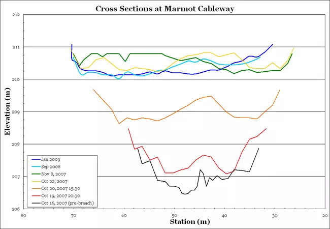 View Original Image at Full SizeFigure 5: Repeat cross sections at the Marmot cableway (Figure 4). Rapid sediment deposition and aggradation of the channel bed is evident in this series of cross sections. Notice some erosion at this site between September 2008 and January 2009.