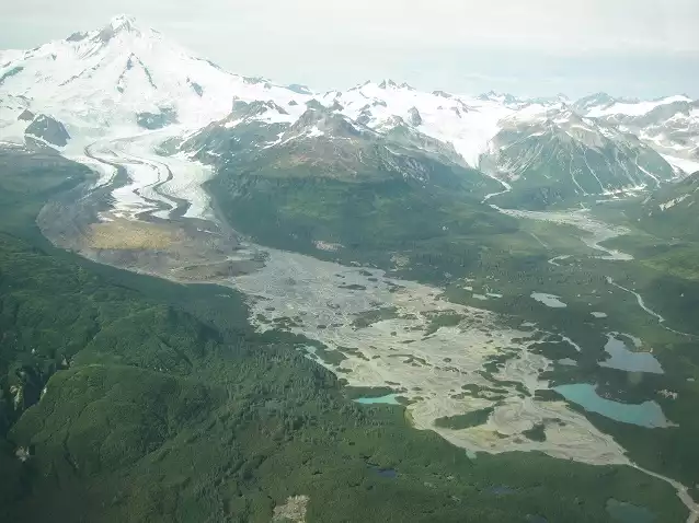 The outwash plain in front of the Red Glacier in Lake Clark National Monument (Alaska) ends far away from the glacier and is characterized by braided rivers and small ponds.