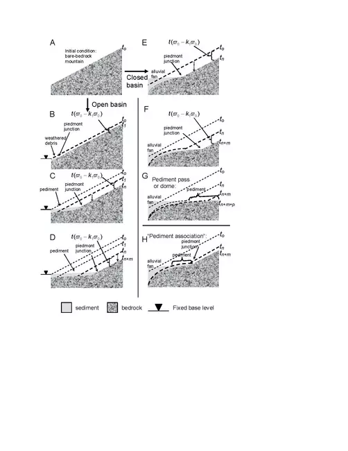 Cartoon illustrations of pediment development for both open- and closed-basin conditions, from numerical modeling experiments in Strudley et al. (2006). Bare-bedrock uplands lack topographic detail because of simplified initial conditions and the absence of bedrock incision by stream flow in the model. Time steps (t) are arbitrary and are used for illustration only; subscripts n, m, and p are used to denote large advances in model time (103-106 yr), while numeric changes in subscripts (0 to 1) indicate consecutive model time steps. Dashed lines illustrate bedrock surface for previous time step, t. Figures not drawn to scale; sediment thickness on pediments exaggerated for clarity. (A) Initial condition for open- and closed-basin models. (B-D) Open-basin pediment development: pediment and piedmont junction form as soon as the foot of the mountain mass retreats from the position of the fixed base level (time steps t0 to t1). Headward extension of pediment and piedmont junction continue through time step tn. (E-G) Alluvial fan and pediment development under closed-basin conditions. Following upslope migration of a piedmont junction, the mountain mass has eroded completely, leaving a pediment surface upslope and alluvial fan downslope (G). (H) Weathering rates an order of magnitude higher, combined with slightly higher rainfall rates (intensity or duration increased by a factor of ~2.5), produce faster growing pediments and, a ‘pediment association’ (downslope fan deposit, midslope pediment, and remnant mountain mass).