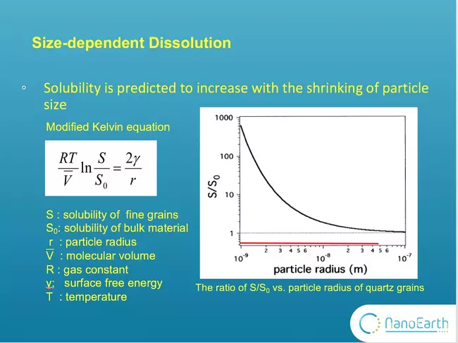 View Original Image at Full SizeQuartz Solubility as a Function of Particle Size; a graphical representation of the modified Kelvin equation that shows that solubilities are constant for particles larger than 100 nM, but solubility greatly increases for particles smaller.