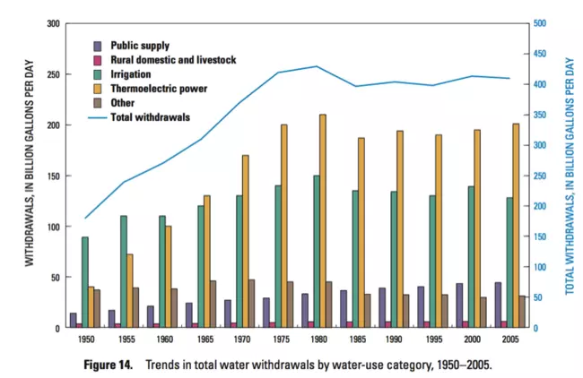 Trends in total water withdrawals by water-use category, 1950-2005. Figure examines 5 different water users: public, rural domestic, irrigation, thermoelectric and other, and total withdrawals. Rural domestic water withdraws have stayed fairly consistent around 10 billion gallons a day. Public supply has slowly increase from 20 billion to 45 billion. Other uses have decrease by about 10 billion to around 35 billion. Irrigation has increased from 1950-1980 but then decreased slightly until 2005 to around 110 billion. Thermoelectric power increased steeply from 1950-1980 and then leveled out around 170 billion. The total withdrawals trend similarly increases from 1950-1980 and then levels out around 400 billion gallons of water withdrawn per day.