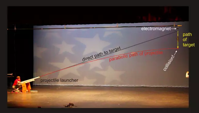 photo shows the stage set-up for a pneumatic cannon that launches a tennis ball. The cannon is aimed at a cymbal that will begin to fall the instant the tennis ball is fired.