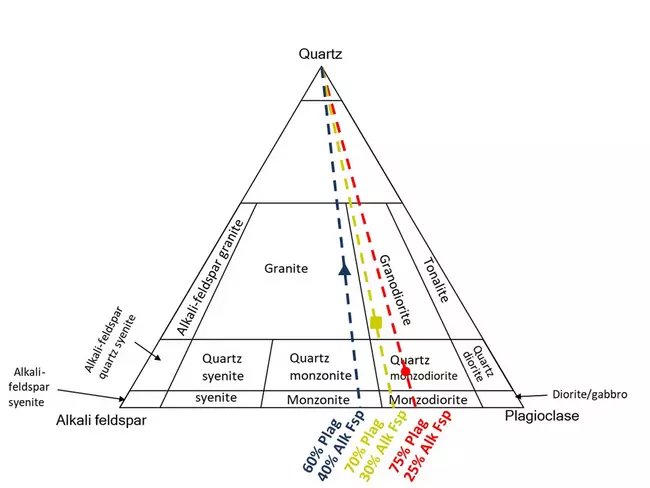 View Original Image at Full SizeQAP ternary diagram with three minerals plotted and lines drawn to indicate the two different feldspar quantities.