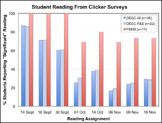 View Original Image at Full SizeFigure 1. Plot of student self-reported reading from clicker surveys given on eight different days throughout the semester. Students in the experimental group (red bars) consistently reported reading more deeply than those in the control group (all students = dark blue; first and second-year students only = light blue).