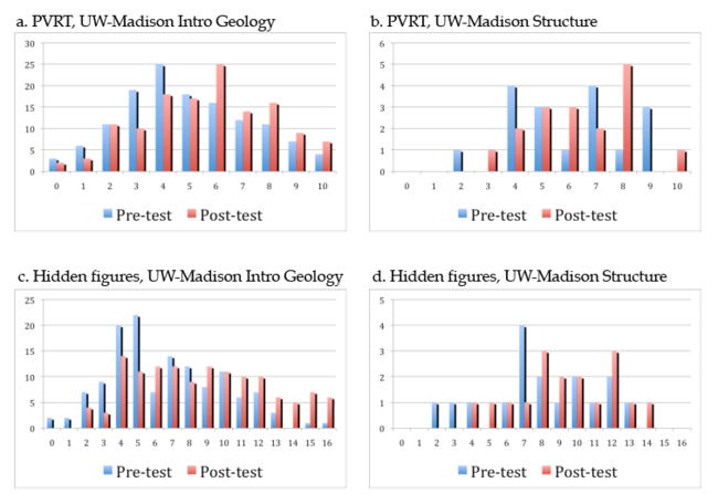 View Original Image at Full SizeData from classroom testing. Frequency vs. test score for mental rotation (PVRT) and embedded figures (hidden figures) tests, UW-Madison Physical Geology and Structural Geology classes, spring 2010. Image created by Carol Ormand.