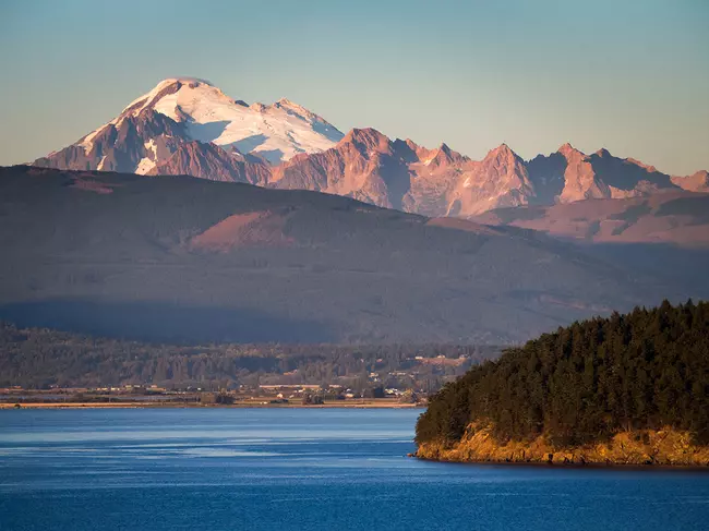 Mount Baker volcano and Twin Sisters dunite with Puget Sound and San Juan Islands in the foreground. Photo by Dan Coe, WGS/DNR