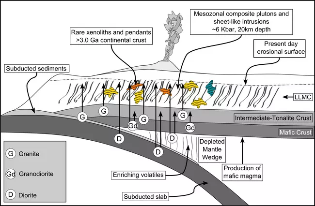 Conceptual model of melting of numerous source rocks to generate the 2.8 Ga Long Lake Magmatic Complex, Beartooth Mountains