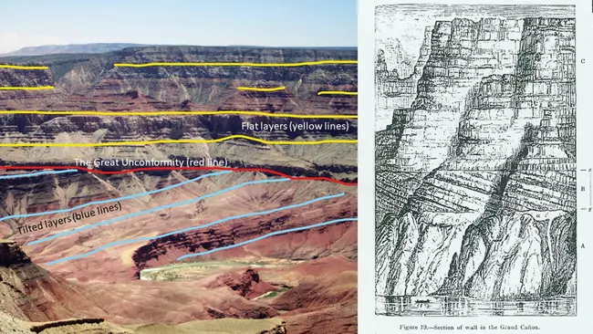 At right is the first stratigraphic section of the Grand Canyon, from John Wesley Powell’s 1875 report, showing what would later be termed the Great Unconformity. Letter A is the metamorphic basement—the oldest rocks. B is the Precambrian Grand Canyon Supergroup, which is composed of tilted sedimentary rocks that lack fossil assemblages. C indicates Paleozoic rocks, which contain fossils marking the explosion of life. Two unconformities can be seen at x and y, with the former marking the Great Unconformity. At left is a recent photograph of Grand Canyon from Walhalla Plateau, with the red line showing the Great Unconformity. Credit: Annie Scott/USGS