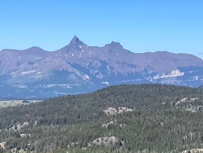 Profile of Pilot and Index Peaks in the Absaroka Volcanics. The prominent white ridge is the Ordovician Bighorn Dolomite which marks the Heart Mountain Detachment.