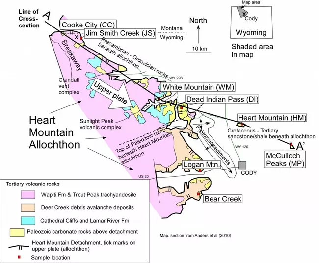 Geologic map of Heart Mountain Detachment Fault (bold black line separating colored upper plate from white lower plate in figure) and adjacent rocks, northwestern Wyoming. White arrow labeled “Upper plate” shows direction of movement of rocks above the Detachment (the colored units west of the detachment on the map). Sample locations discussed in text are shown. Geology is modified from Anders et al. (2010).