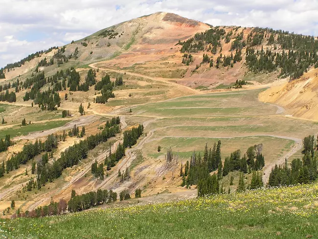 Photograph of Fisher Mountain, site of the Fisher Mountain stock and mineral deposits, viewed toward the northeast from Daisy Pass. The disturbed area in the center is the historic McLaren open-pit gold mine—last worked in 1953. Photograph taken in 1992.