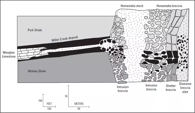 Schematic cross section illustrating the geologic setting of the stratabound Miller Creek gold-copper-silver deposits relative to the Homestake deposits. Replacement deposit material is shown as solid black.