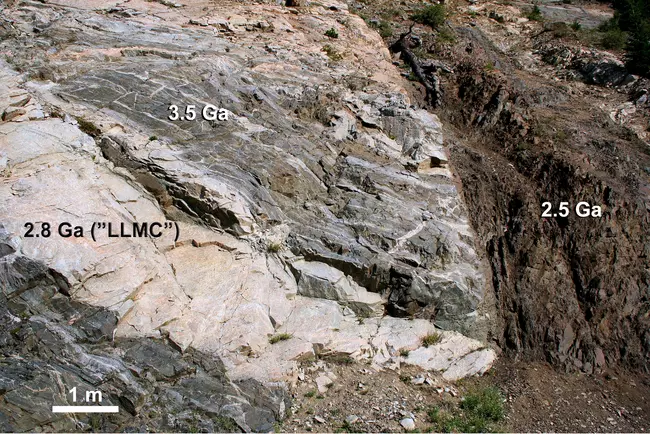 Lower Quad Creek Outcrop with 3.5 Ga Gray Gneiss, 2.8 Ga granite injection, and 2.5 Ga Cross Cutting Mafic Dike