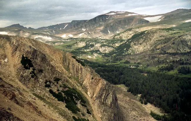 Hellroaring Plateau Pendant, layered metamorphic rocks in foreground, younger 2.8 Ga granitic rocks to skyline, Mt. Rearguard.