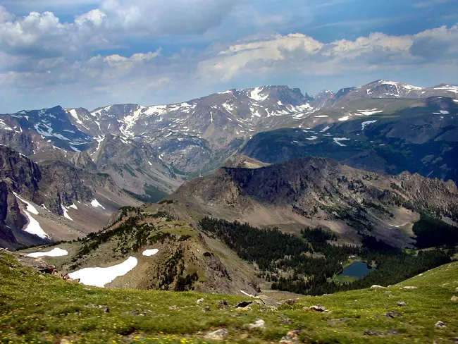 Rock Creek in foreground left, Twin Lakes foreground right, and the "Bear's Tooth" on the sky line.