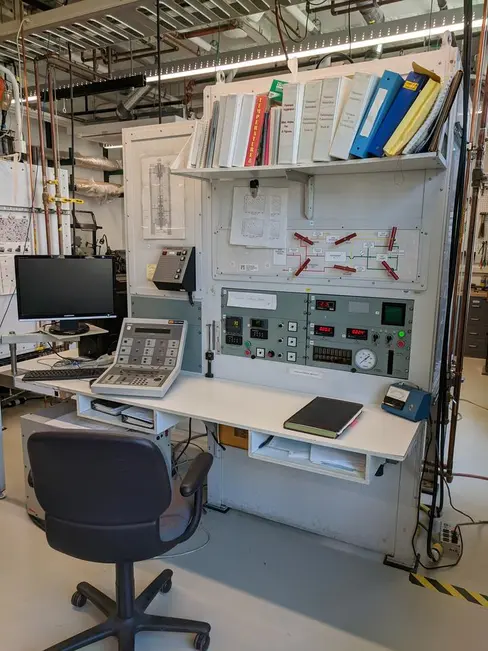 Paterson Apparatus (PI-3) at the UMN Rock and Mineral Physics Laboratory. PI-3 was one of the first three commercially made Paterson apparatus and has been the workhorse of our lab since it was first installed in the early 90's. Confining pressures up to 300 MPa are generated by Argon gas. Temperatures up to 1250°C are generated by a furnace internal to the pressure vessel. A major benefit of this particular furnace design is the relatively small temperature gradient across the sample (~1°C over the entire sample length). A compensated actuator allows for axial compression and extension of samples that are on the order of 1 to 3 cm in length.