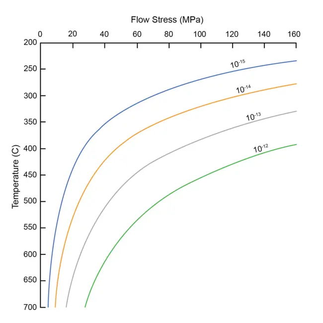 View Original Image at Full SizeGraph of flow stress vs temperature. Strain rate curves from Hirth et al. (2001) and Rutter and Brodie (2004).