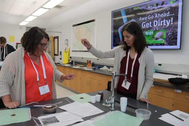 Two people doing an experiment with a water dropper and dirt Originally uploaded in SERC:About SERC.