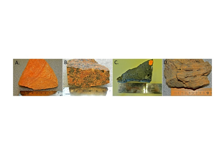 View Original Image at Full SizeFigure 2 Possible rocks on Mars: A. Sandstone, B. Potassium Feldspar Granite, C. Basalt, D. Oxidized Basalt; Image Credit: Mars for Earthlings, University of Utah, Levi Huish.